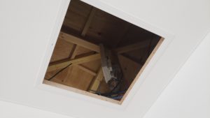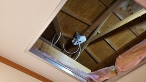 工事は、今屋根裏内で仕切り壁に遮られていたため、既存の配線を利用しました。
